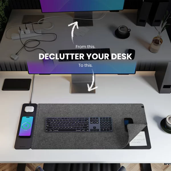 Experience the ultimate desk organization with our double-sided desk mat ALTI ULTRA. One side boasts a luxurious vegan leather surface, while the other offers soft felt. In between, you’ll find a concealed document hideaway zone. Plus, it’s equipped with a 15W MagSafe charging pad for your iPhone and wireless charging for your AirPods. Stay stylish and organized with this all-in-one desk mat.